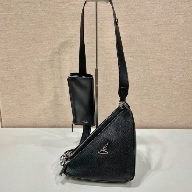 프라다 트라이앵글 사피아노 레더 디태처블 파우치 더블 숄더백 블랙